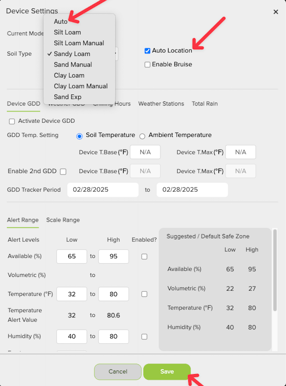 If you plan to use a Beacon in a new field area, any manual soil calibration settings that were applied or auto location that was turned off should be reset and re-enabled so that the Beacon can automatically calibrate to the soil type it is buried in.